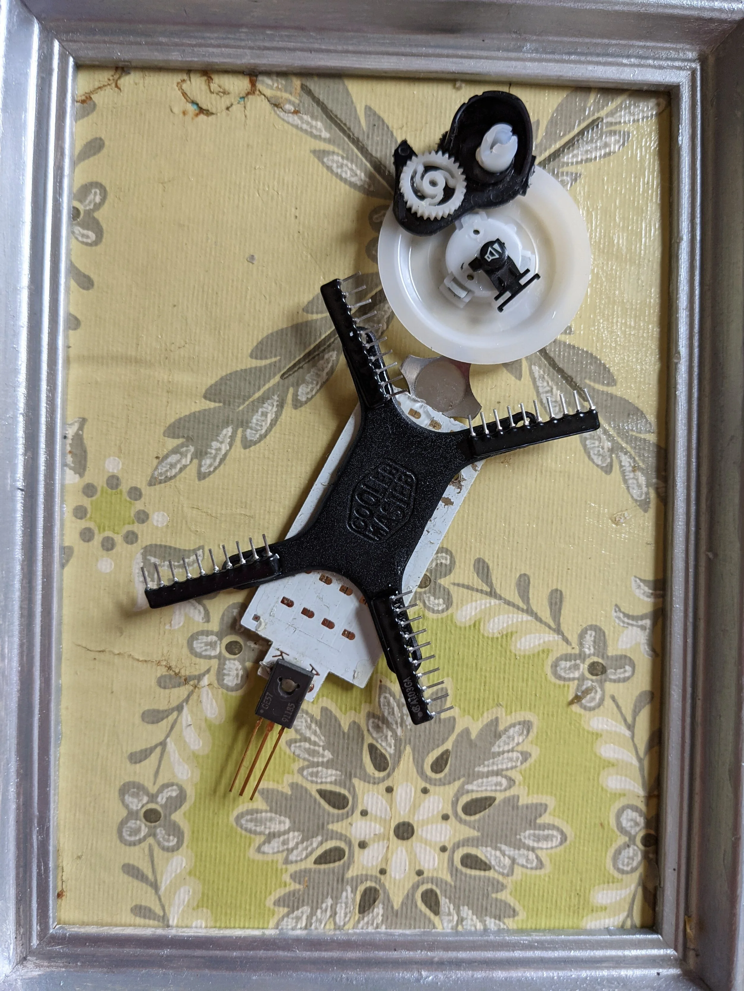 Assemblage of Recycled Computer parts arranged over imagery of green, purple, yellow, white Iranian tiles. Parts include orange copper, dichromatic glass, circuit board, fan cover.